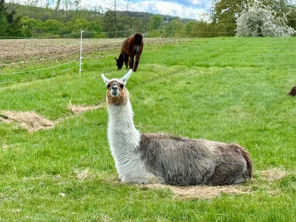 Der Weg der längeren Wanderung – ca. 13 km – führt bergab an einem Angelteich vorbei und quert dann die Landstraße nach Oberkleen. Von hier aus wandern wir durchs Saugrundbachtal bergauf zum Aussichtspunkt Schorn. Weiter geht’s durch schönen Wald und entlang von Wiesen vorbei zum Kleebach. Dort bei der „Alte steinerne Brücke“ wollen wir evtl. mit den Teilnehmern der kürzeren Tour zusammentreffen und gemeinsam das letzte Teilstück zurück wandern, vorbei am Gatter der lieblichen Poitou-Esel beim alten Forsthaus und dem Gehege der „stolzen“ Lamas zum Parkplatz.